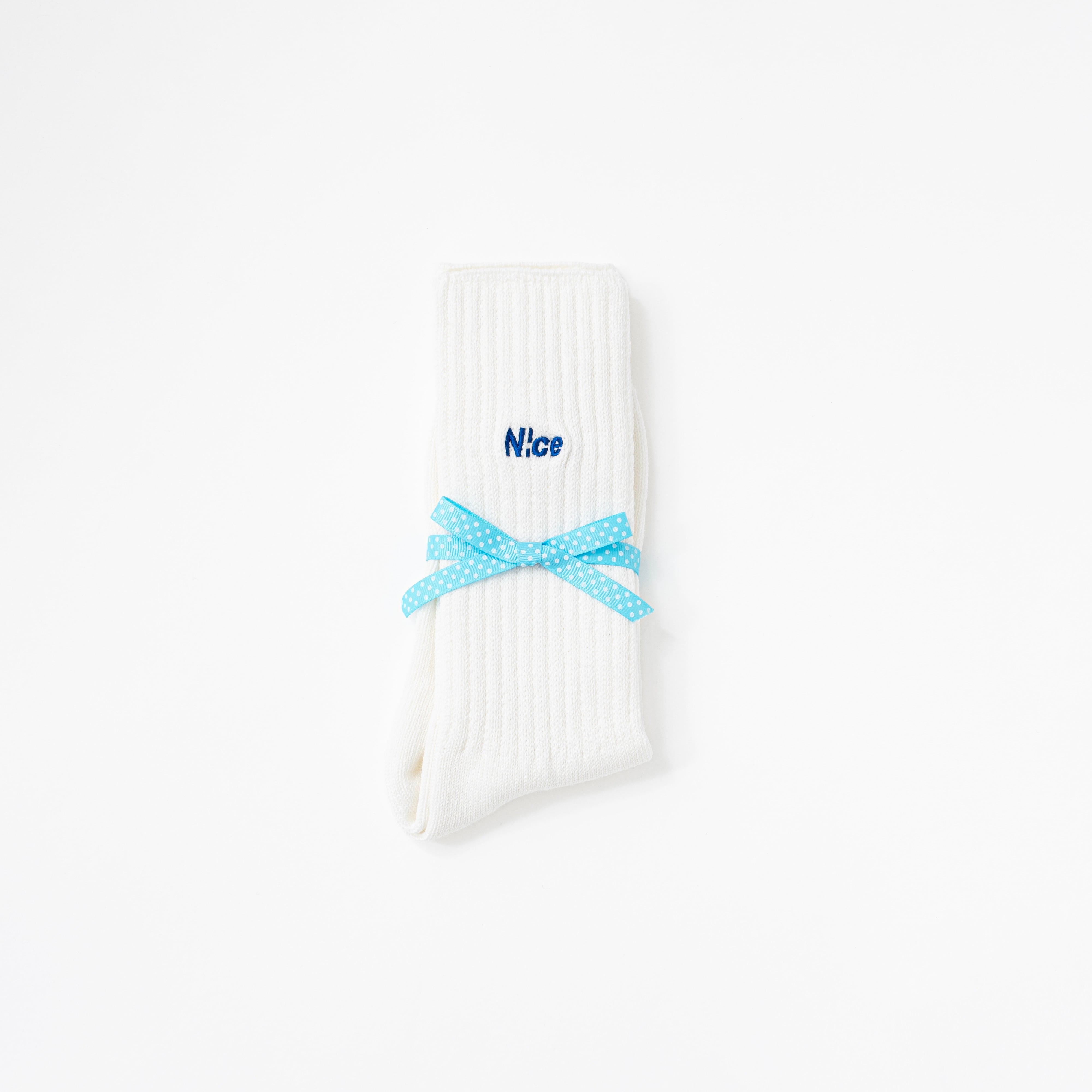オリジナルのソックスをメインに扱う大阪発のブランド「WHIMSY SOCKS」とのコラボアイテム。白ソックスにN!ceロゴをあしらった定番デザイン。履き心地の良さとほどよいリブ感がポイント。